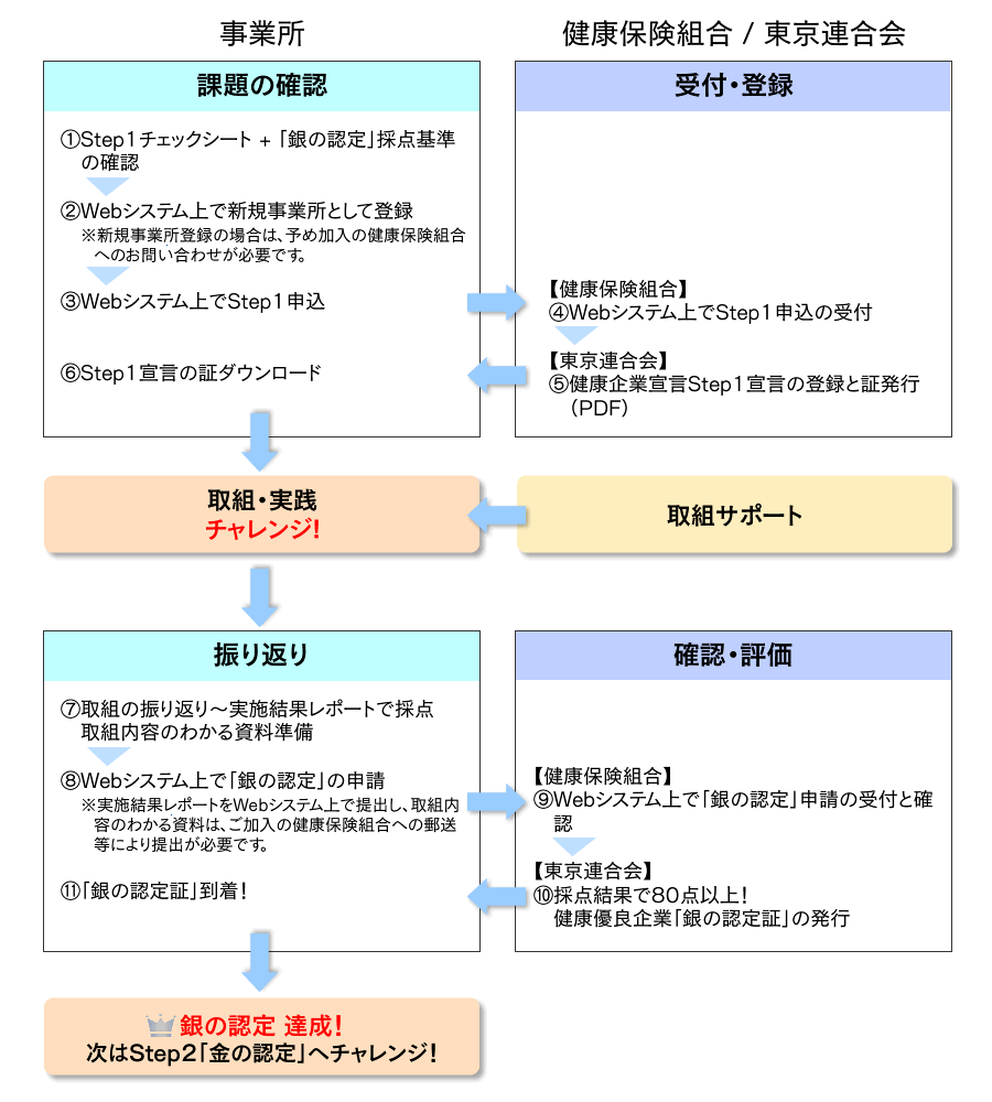また、経済産業省等において推進する「健康経営優良法人認定制度」の中小規模法人部門に申請する場合、「健康企業宣言」に参加し、銀の認定を受けることが必須となっております。